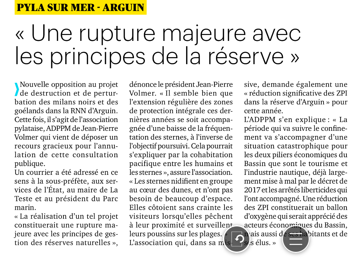 Votre association a bonne presse ! Vous trouverez ci-dessous les derniers articles qui sont consacrés à notre activité. Intervention pour l'autorisation de gagner son corps mort, SO mai 2020 Demande de report consultation destruction sternes et goélands LDB mai 2020 Demande d'accès aux corps morts SO mai 2020 Sud-Ouest, Novembre 2019 - Notre lettre au Ministère de l'Environnement - ZPI Arguin La Dépêche du Bassin - Novembre 2019 - Notre lettre au Ministère de l'Environnement - ZPI Découvrez l'article de Sud-Ouest du 29.08.2019 sur les abattages de pins au Pyla Cliquez ici pour lire l'article de Sud-Ouest du 27.08.19 (réservé aux abonnés) sur les abattages de pins. Vous trouverez un lien vers la vidéo de notre AG. Le reportage de France 3 du 26.08.2019 sur les abattages Consultez le compte-rendu de notre AG du 10 août 2019 dans Sud-Ouest Consultez l'article de La Dépêche du Bassin sur nos fiches Belles Villas au Pyla Consultez l'interview donnée par notre Bureau à La Dépêche du Bassin, 9 aout 2019 Consultez l'interview donnée par notre Bureau dans Sud-Ouest, 9 aout 2019 Consultez l'article de Sud-Ouest, 19 juillet, sur nos fiches Belles villas au Pyla Consultez l'article de La Dépêche du Bassin qui rend compte de notre lettre aux Préfets sur Arguin, juin 2019 Consultez l'article de Sud Ouest qui rend compte de notre lettre aux Préfets sur Arguin, 19 juin